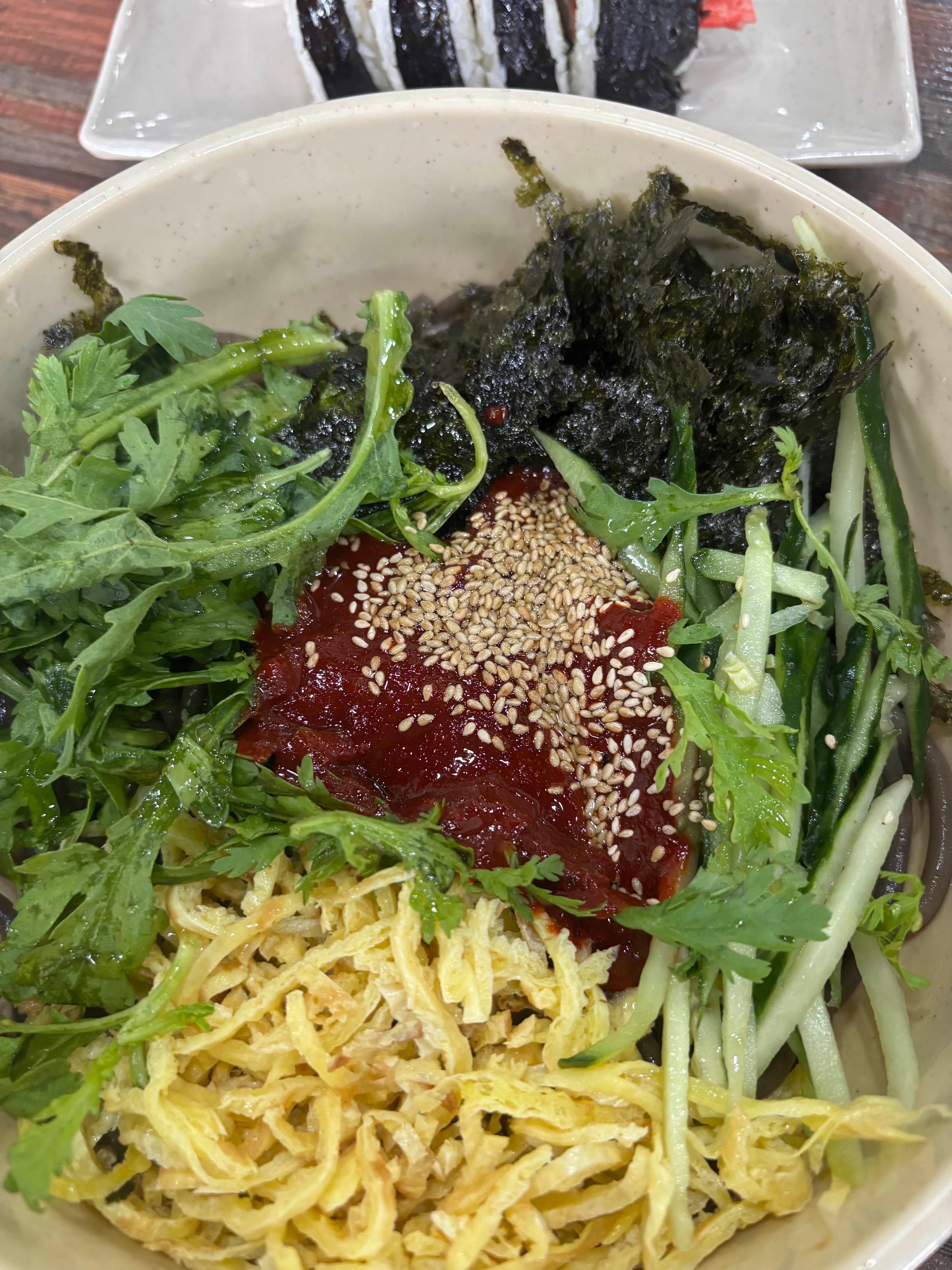 비빔메밀우동은 신선한 쑥갓과 싱싱한 오이, 김,